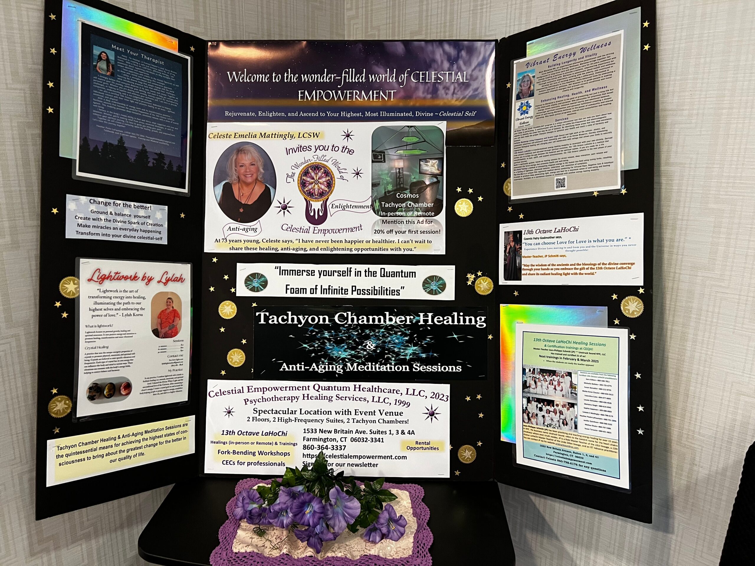 Please sign up for our newsletters on the [celestialempowerment.com] website. And please don’t hesitate to call and schedule some visits for Tachyon Chamber and 13th Octave LaHoChi healing sessions with Celeste, Jenny, and their colleagues.